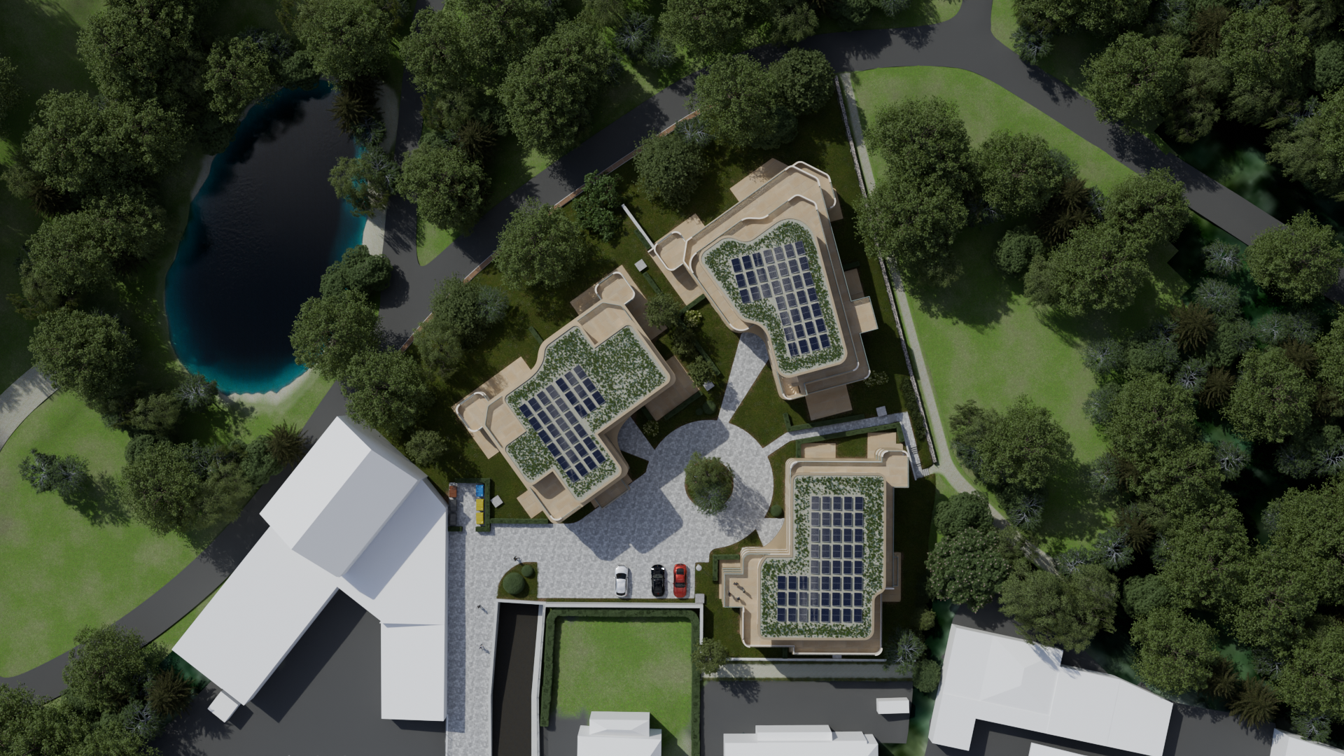 Ein aufwendiges ökologisches Konzept mit begrünten Dächern und Teilen der Fassade, mit ansprechender Bepflanzung des Grundstücks und Einleitung des Regenwassers in einen nahe gelegenen Bach, dazu modernste Technik wie Fußbodenheizung, Photovoltaik, Luftwärmepumpen oder kontrollierte Wohnraumlüftung tragen zur Besonderheit und Nachhaltigkeit dieses Projektes bei.